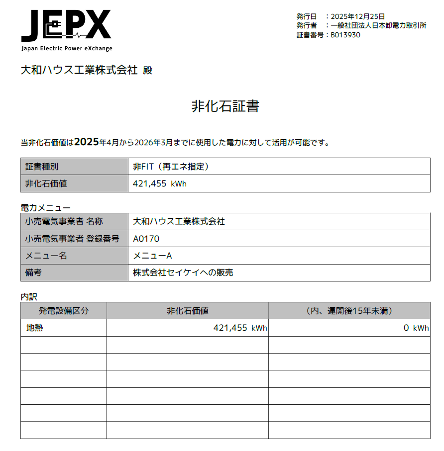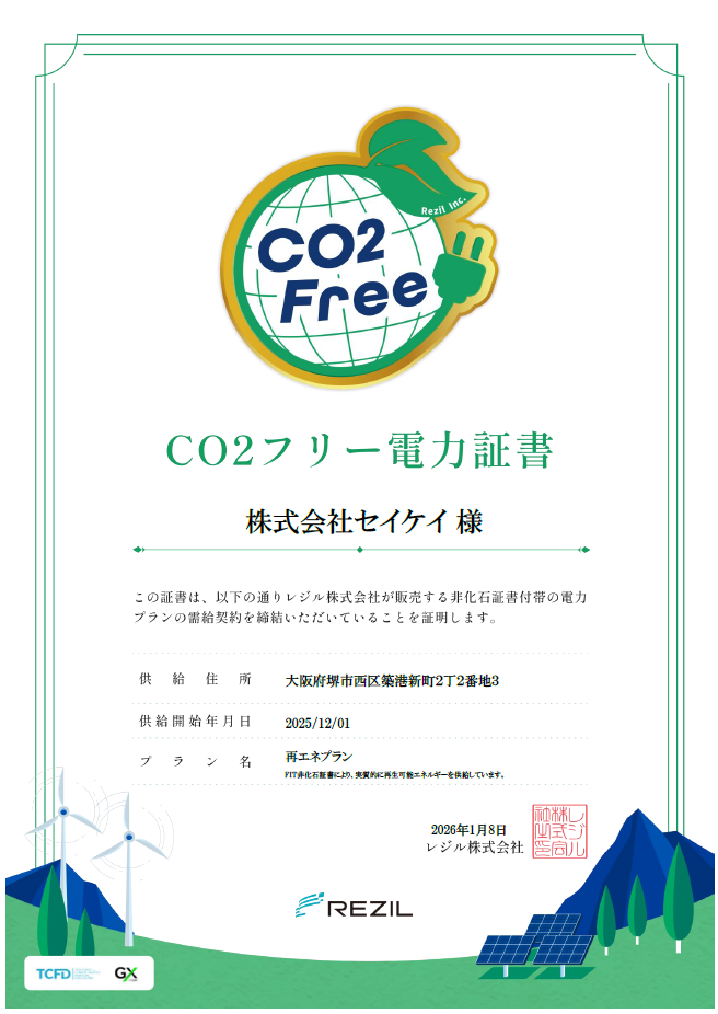 当社は、事業活動における環境負荷低減を重要な責務と捉え、全電力を非化石エネルギー由来の電力へと切り替えました。これにより、CO₂排出量の削減と持続可能な社会の実現に貢献してまいります。今後も再生可能エネルギーの活用を拡大し、低炭素経済への移行を加速させます。